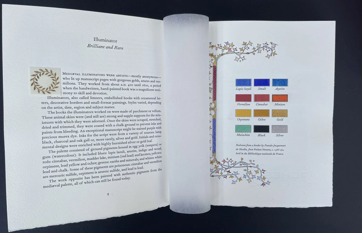 2014, 8vo, 53 pp and 24 sample leaves. Edition of 30 and five A.P. numbered copies. Set in Fournier, printed by David Clifford at Black Stone Press on Arches Velin. Bound in quarter leather with leather fore-edges. Out of print.