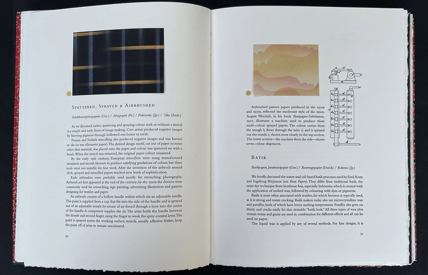 Our books on techniques for decorating paper were a natural venue for Claudia’s extensive collection of paste, marbled, block-printed, stencilled and dyed papers. Her first book on the subject, Chasing Paper, led us to develop Decorating Paper, a two-volume exploration of the many techniques used to create coloured and patterned papers. In it we describe the history, as well as the detailed processes of each technique and offer hundreds of original samples. This endlessly fascinating topic led to Suminagashi, a miniature showcase of the Japanese marbling technique on various papers, and to Marbled Paper, which explores the effect of different papers on the appearance of marbling.