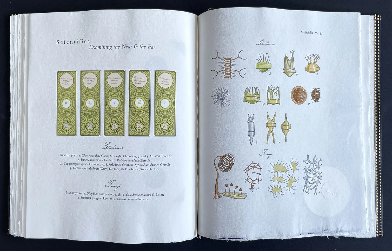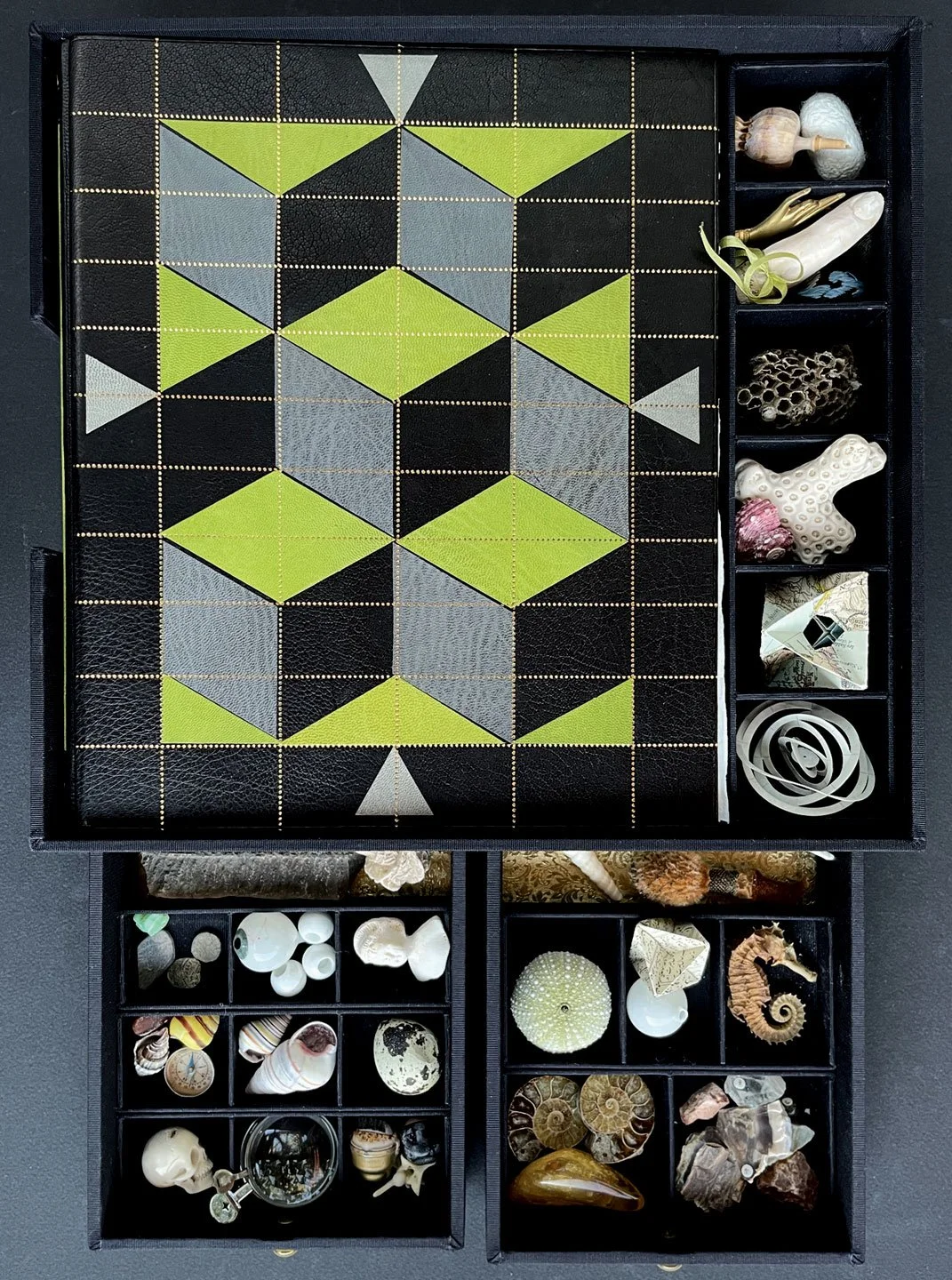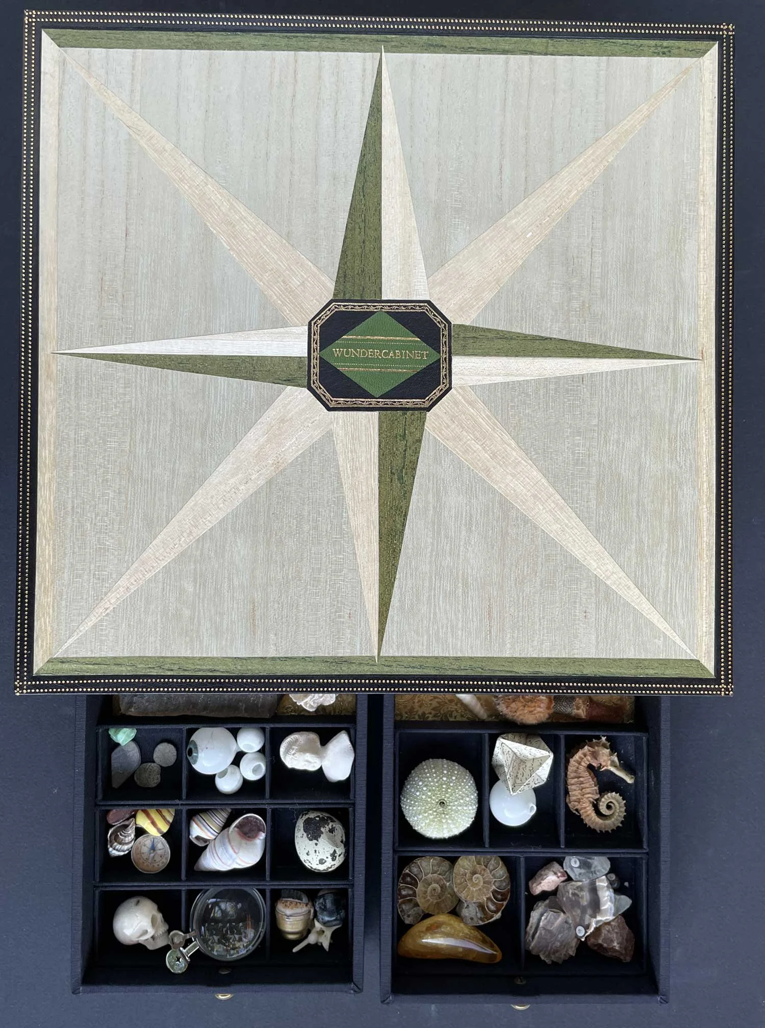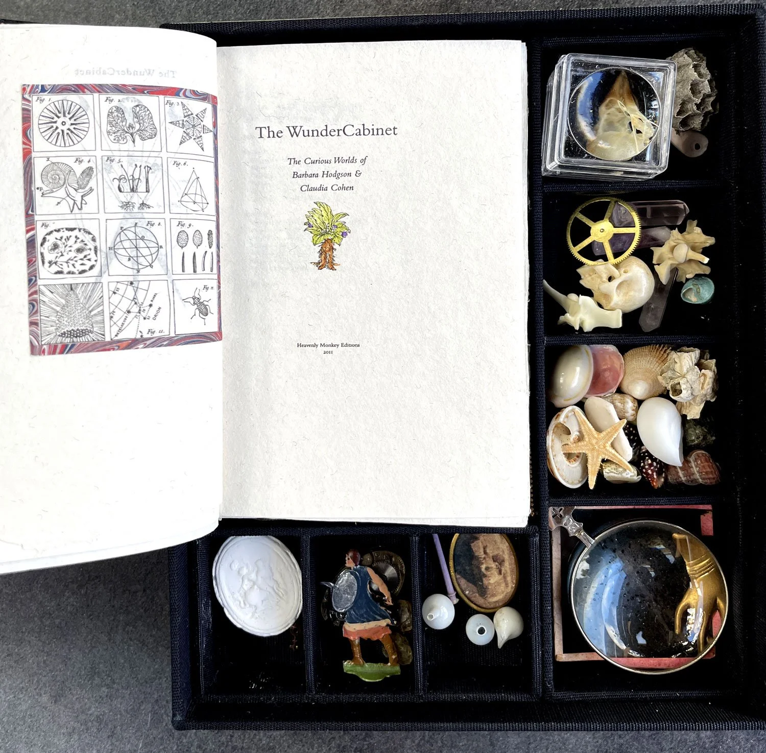The WunderCabinet is the book we made because we both wanted our own Cabinet of Curiosities. And we decided that if we wanted one, then others must want one, too. The book is modelled after the 18th–century encyclopedias, which were essentially cabinets on paper. Most of the illustrations were drawn by hand from historic reference, then meticulously hand coloured. The book is housed in a box with partitions to hold essential cabinet objects: lenses, shells, sea urchins, fossils, the plaster cast finger of Princess Dashkov, and so on. We also made a miniature version of the book in a very limited number of copies.