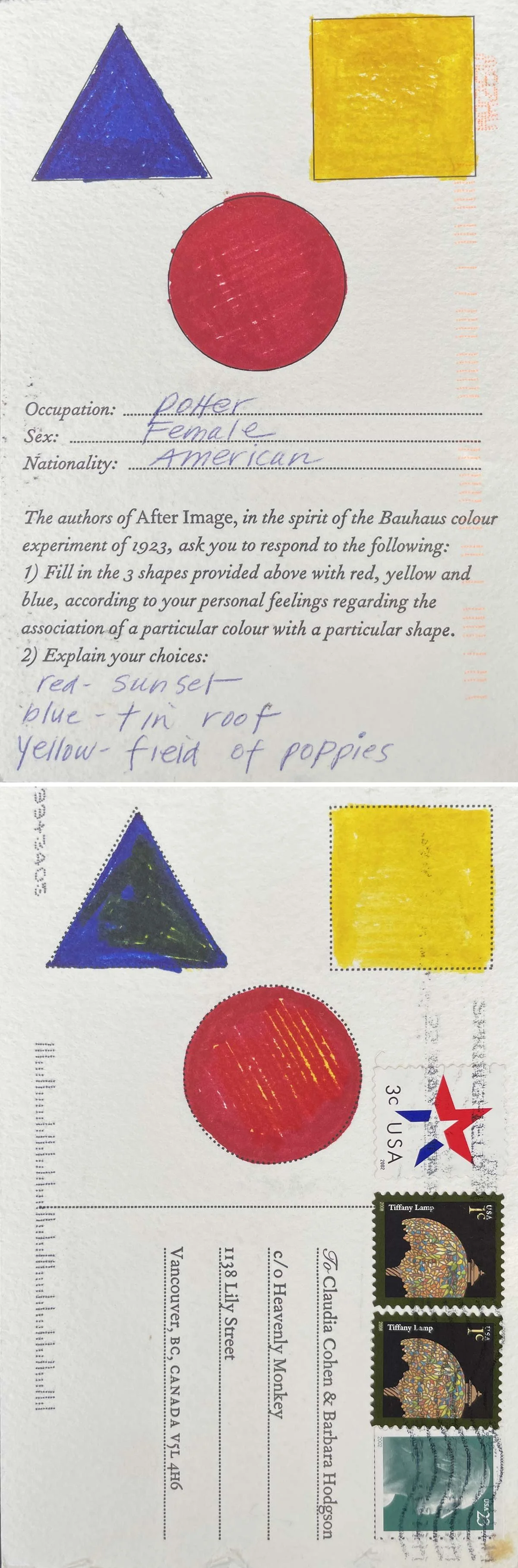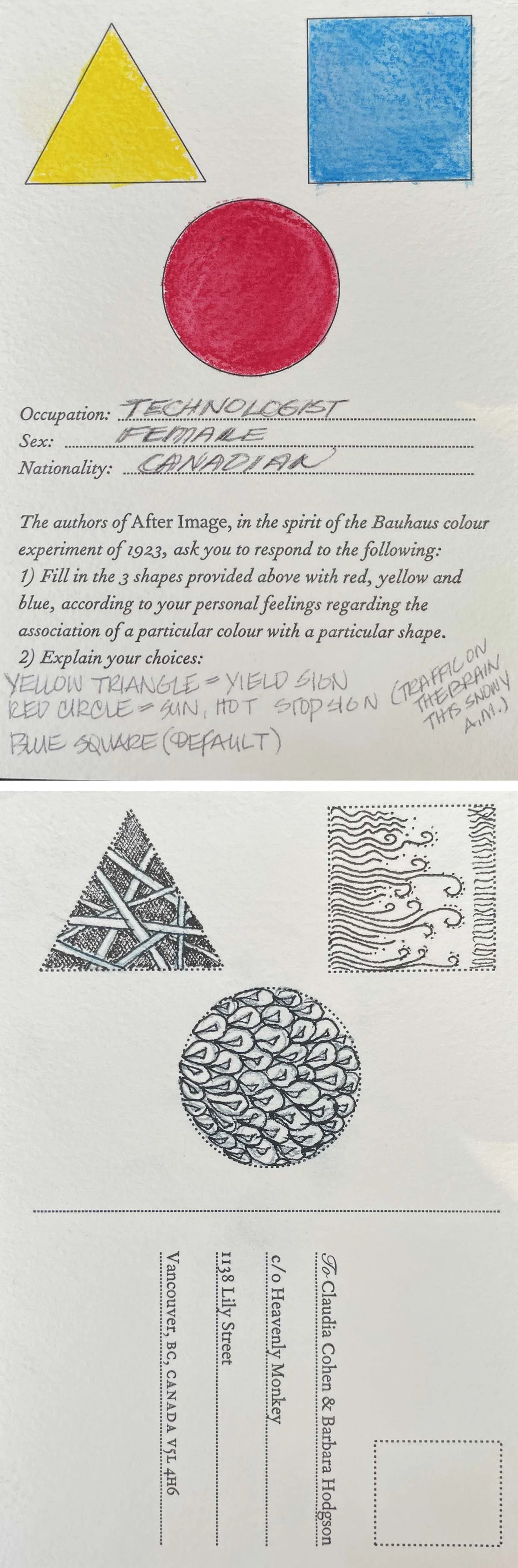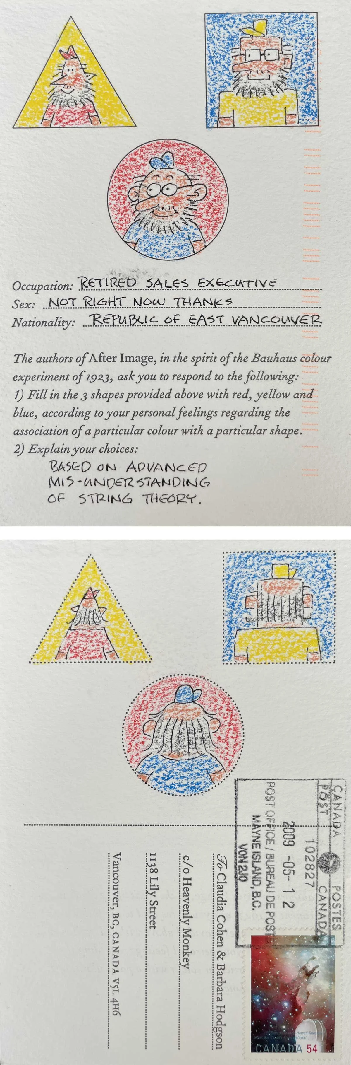 These respondents used both sides of the card. Some even affixed the supplied “After Image” stamp, in place of postage. Two of those cards, one from Canada and one from the U.S., were cancelled and delivered with no additional postage added.
