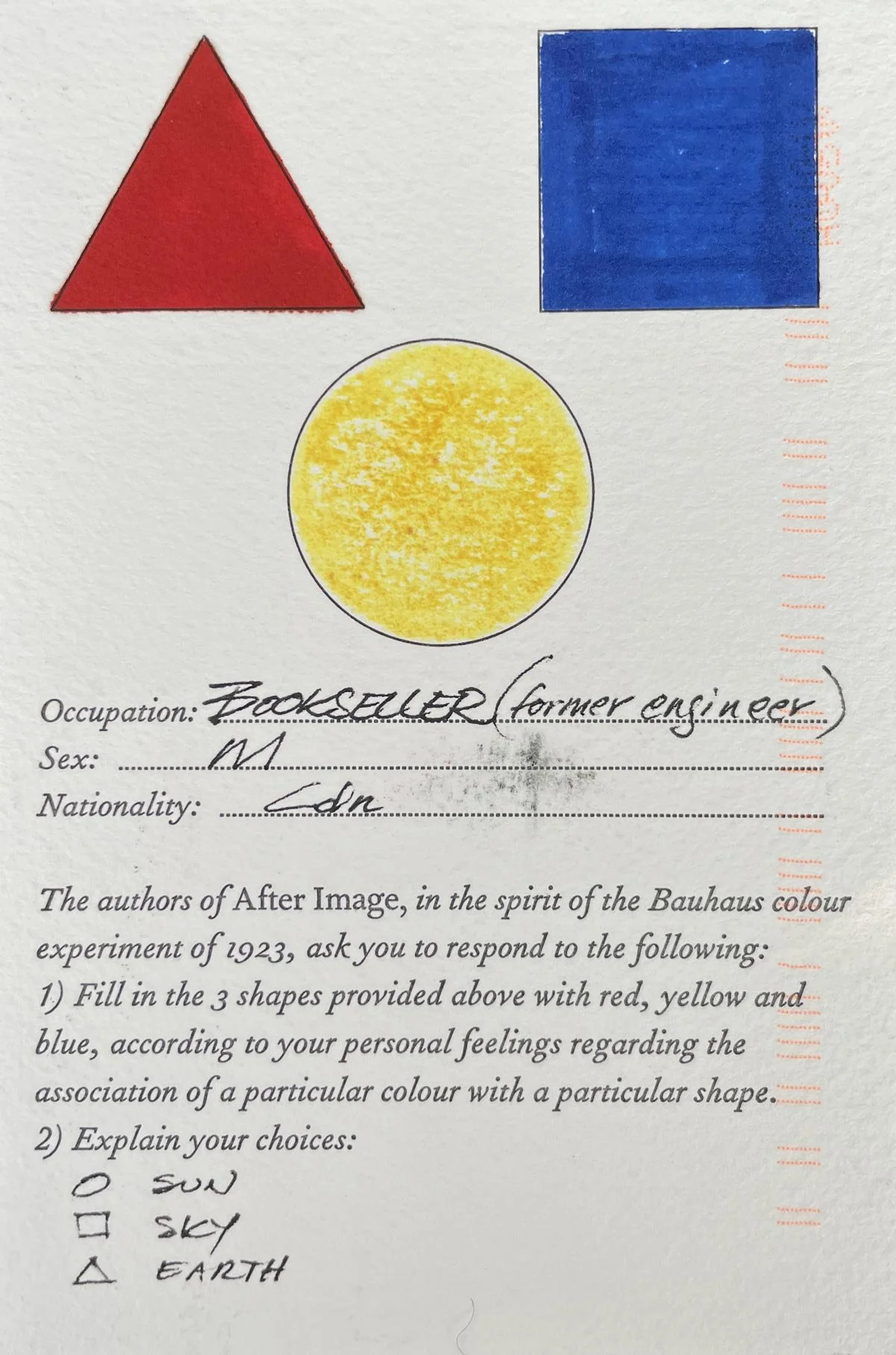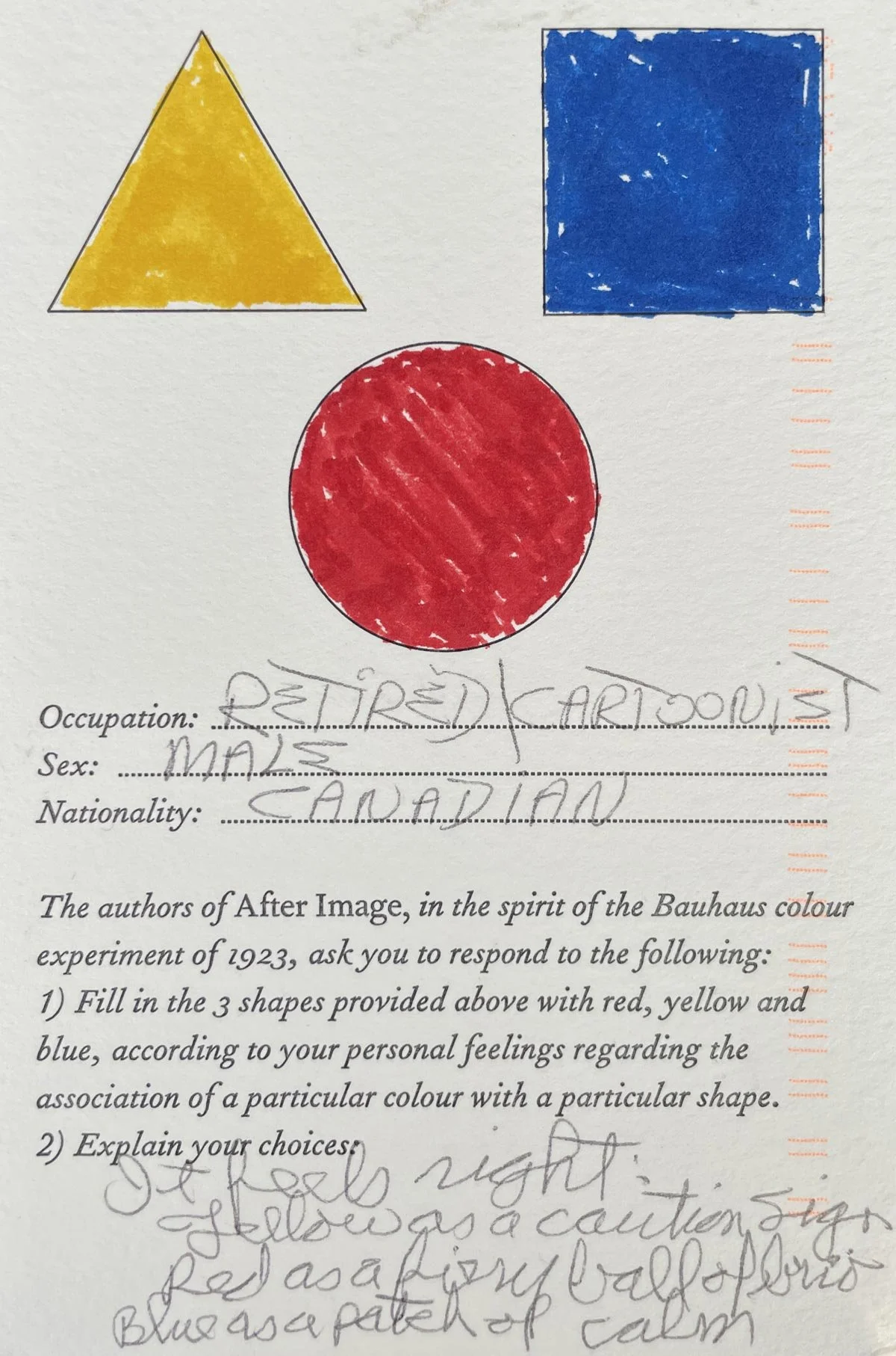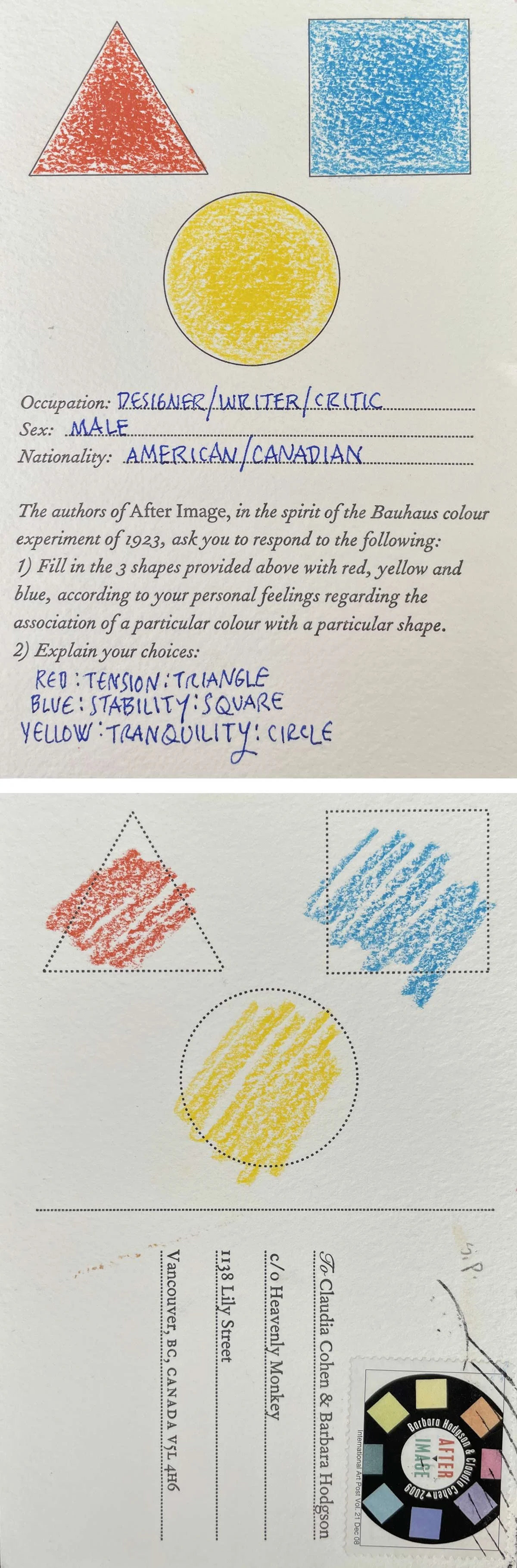 In 2009, nearing completion of After Image, we decided to produce a postcard modelled after the original Bauhaus colour experiment of 1923. We sent out some 80 or 90 of these cards and about 70 were coloured in and sent back. Since then, we have managed to display the cards twice at Alcuin Society Wayzgoose shows, but most of the recipients have never seen the other responses. The full selection is shown below, divided into colour choices.